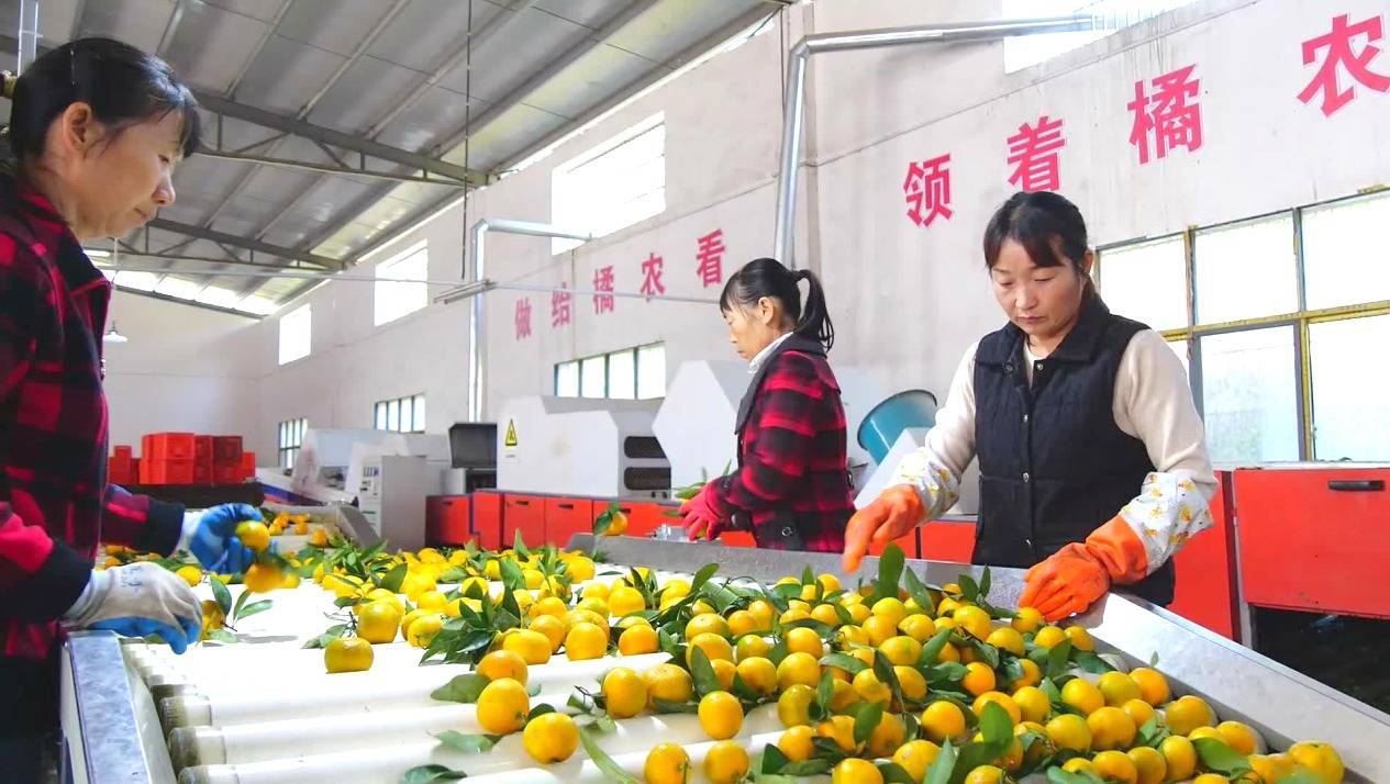 在南漳县民邦助农贸易有限责任公司的分拣车间里,上百名工人正有序对每天采收的8万多斤柑橘进行清洗、分拣和封装,随后运入冷库贮存,最大程度保障柑橘新鲜度。